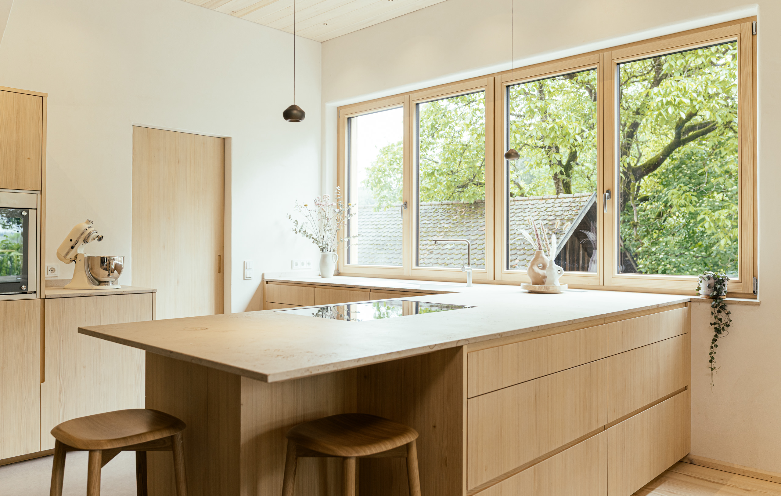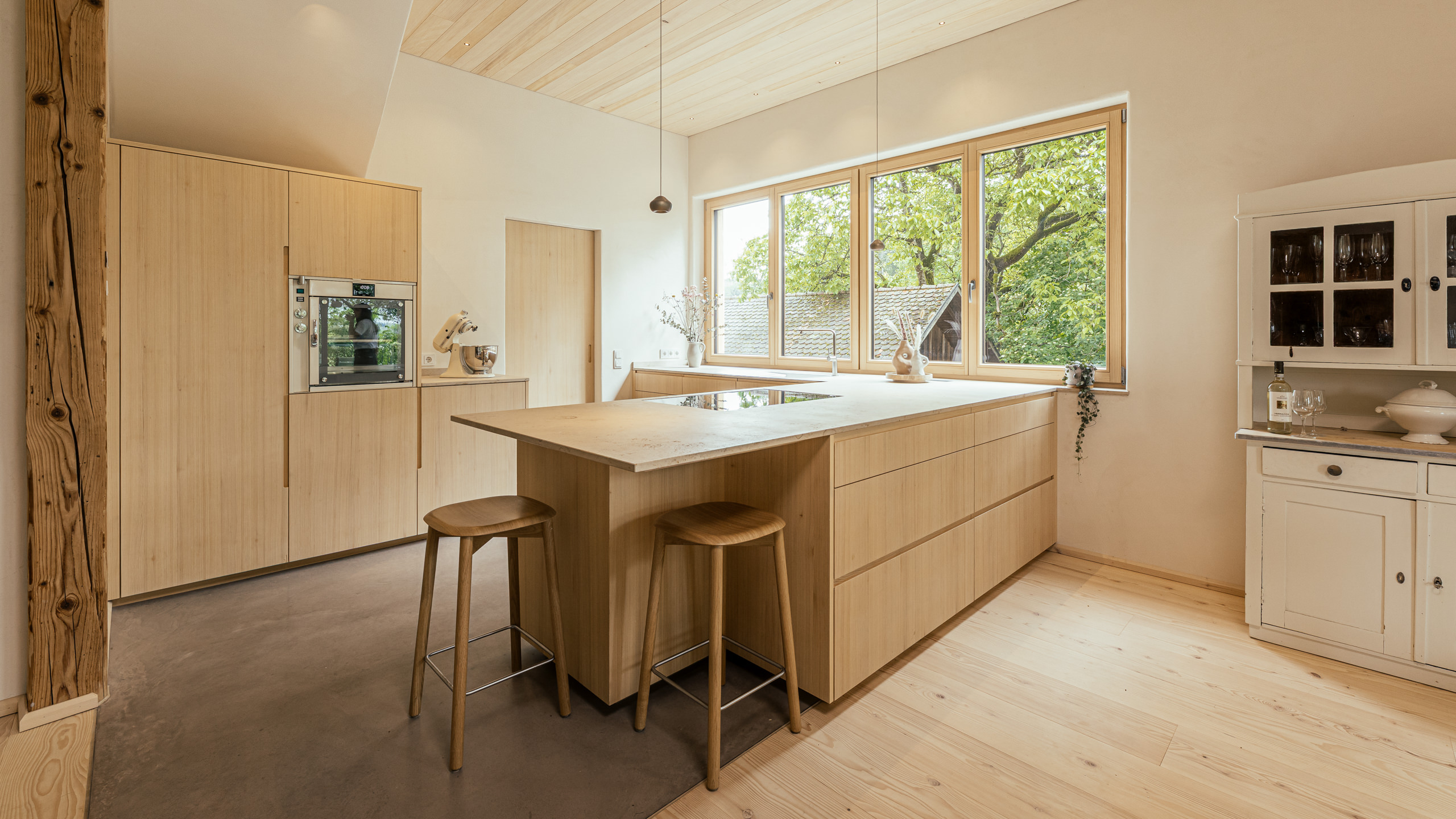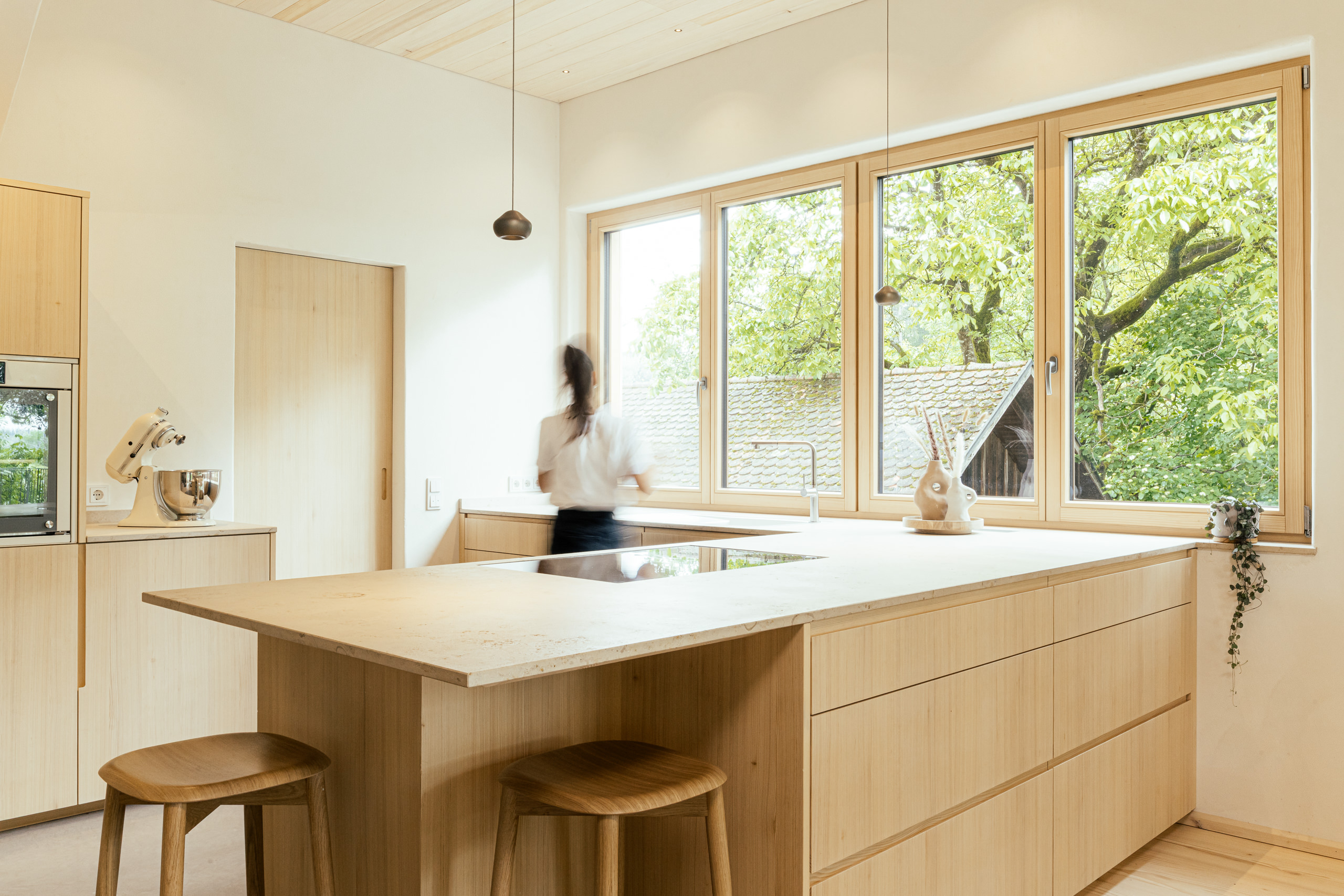 Aus einem historischen Stadel entsteht ein Wohnhaus für eine junge Familie – charmant, naturverbunden und mit Respekt vor der ursprünglichen Gebäudestruktur. Helle, ruhige Naturmaterialien schaffen eine harmonische Verbindung zur Umgebung, großzügige Fenster öffnen den Blick nach draußen. Die Küche aus Weißtanne wird handwerklich gefertigt und mit naturbasiertem Öl geschützt. Die Arbeitsfläche aus regionalem Naturstein ist langlebig und authentisch. Für passionierte Bäcker sorgt ein leistungsstarker, energieeffizienter Backofen von „Manz“ für perfekte Ergebnisse.