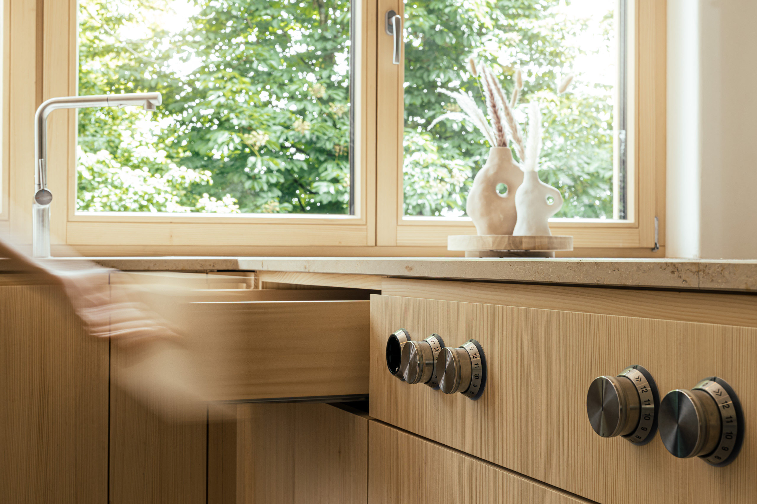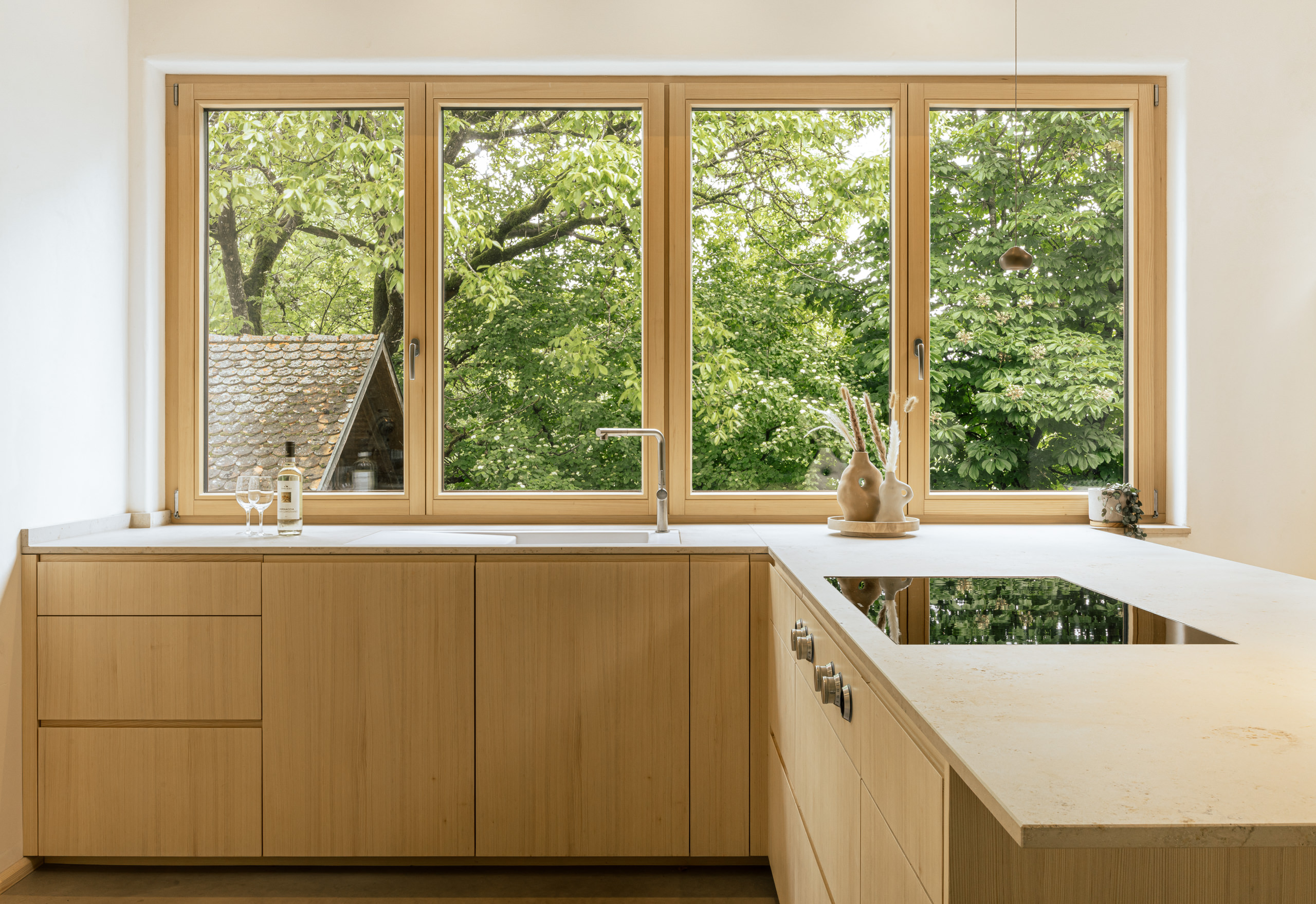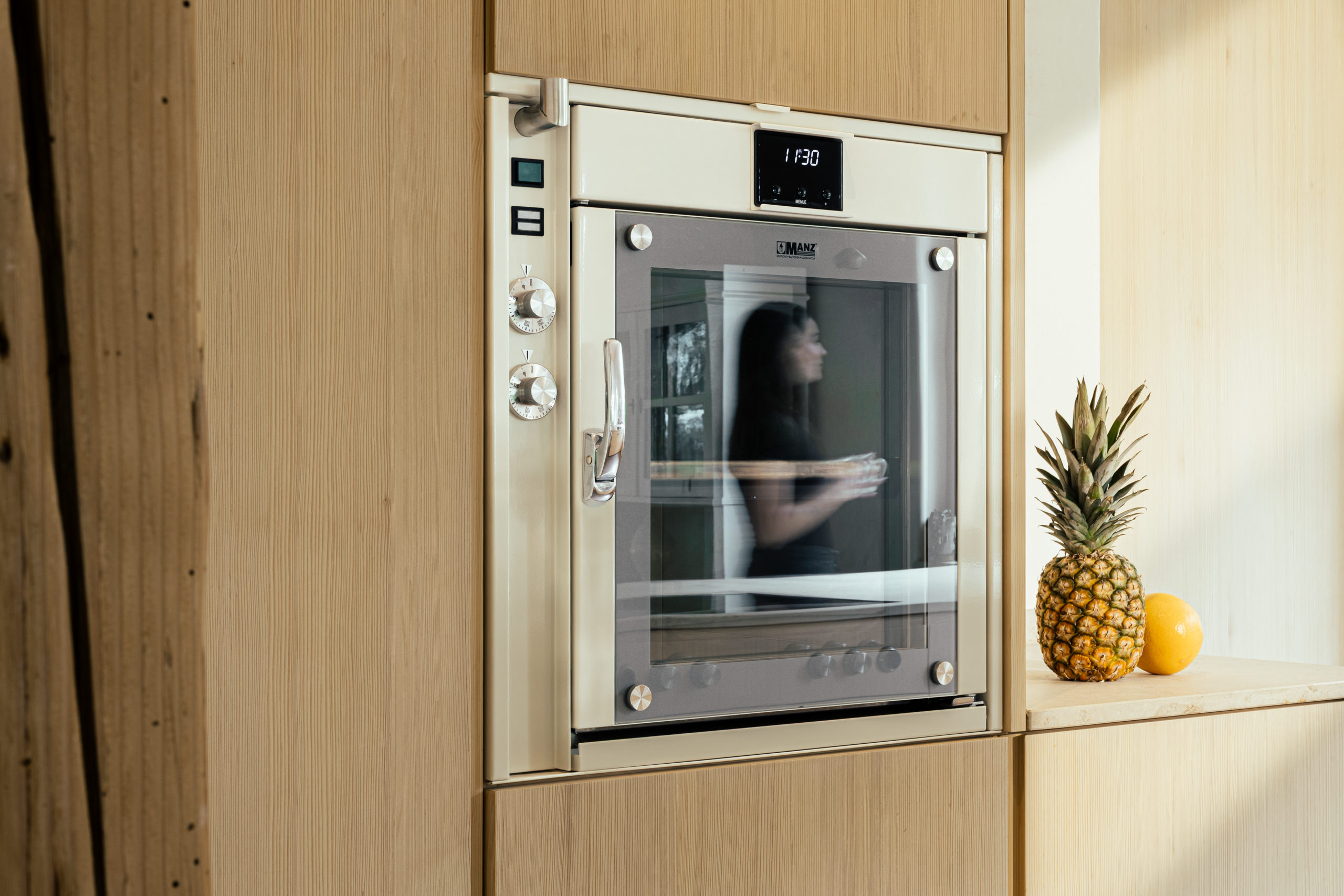 Aus einem historischen Stadel entsteht ein Wohnhaus für eine junge Familie – charmant, naturverbunden und mit Respekt vor der ursprünglichen Gebäudestruktur. Helle, ruhige Naturmaterialien schaffen eine harmonische Verbindung zur Umgebung, großzügige Fenster öffnen den Blick nach draußen. Die Küche aus Weißtanne wird handwerklich gefertigt und mit naturbasiertem Öl geschützt. Die Arbeitsfläche aus regionalem Naturstein ist langlebig und authentisch. Für passionierte Bäcker sorgt ein leistungsstarker, energieeffizienter Backofen von „Manz“ für perfekte Ergebnisse.